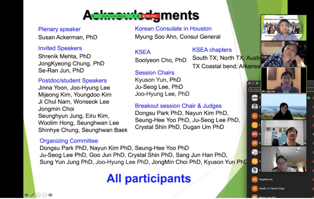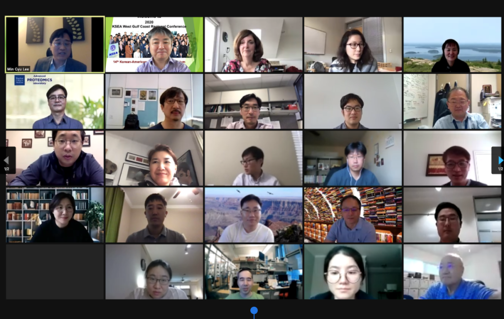 The 11th KSEA West Gulf Coast Regional Conference (WGCRC) – 14th Korean-American Bio-Medical Scientists Symposium (KABMS) was held on Saturday, December 12th, 2020. This event was jointly organized by KSEA Arkansas (CP: Hyunju Jeong, PhD), KSEA North Texas (CP: Wooram Park, PhD), KSEA Texas Coastal Bend (CP: Soojin Yoo, PhD), KSEA Austin Texas (CP: In Hyouk Song, PhD), and KSEA South Texas (CP: Goo Jun, PhD) Chapters. The lead organizers were the conference chair, Dr. Min Gyu Lee, Associate Professor at the University of Texas MD Anderson Cancer Center (UT MD Anderson) and Dr. Goo Jun, Assistant Professor at the University of Texas Health Science Center at Houston (UTHealth). Due to the Covid-19 pandemic situation, the conference was held online via Zoom meetings. The meeting was a huge success with more than 100 people registered and participated, including a keynote speaker, three invited speakers, thirteen oral presenters, and Korean-American faculty members and trainees across the region. The regional conference was supported by KSEA and Consulate Generate of Korea in Houston.