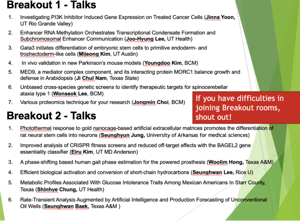 The second session was the oral presentation session chaired by Dr. Ju-seog Lee (MD Anderson), replacing the poster sessions of previous years due to the online setup. The oral presentation session was organized to improve the career development of young scientists and professionals by providing them presentation opportunities and awards. A total of thirteen young researchers including graduate students and post-doctoral researchers presented their original research and were judged by faculties and senior researchers based on their research presentation. We organized two break-out presentation sessions based on the research topics. In biological sciences session, Mijeong Kim, a graduate student at the University of Texas at Austin, was awarded the best presentation award by presenting “Gata3 initiates differentiation of embryonic stem cells to primitive endoderm- and trophectoderm-like cells.” In quantitative biomedical sciences and engineering session, Shinhye Chung, a graduate student at the University of Texas Health Science Center (UTHealth) at Houston, was awarded the best presentation award by presenting “Metabolomic profiles associated with glucose intolerance traits among Mexican Americans in Starr County, Texas.” Second place presentation awards were awarded to: Jinna Yoon (Univ. Texas Rio Grande Valley), Joo-Hyung Lee (UTHealth), Youngdoo Kim (BCM, Baylor College of Medicine), Wonseok Lee (BCM), Jongmin Choi (BCM), Ji Chul Nam (Texas State Univ), Seunghyun Jung (Univ. Arkansas), Eiru Kim (UT MD Anderson), Woolim Hong (Texas A&M Univ), Seunghwan Lee (Rice Univ), Seunghwan Baek (Texas A&M Univ).