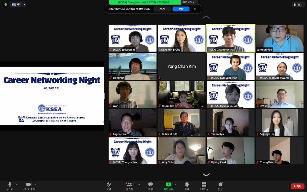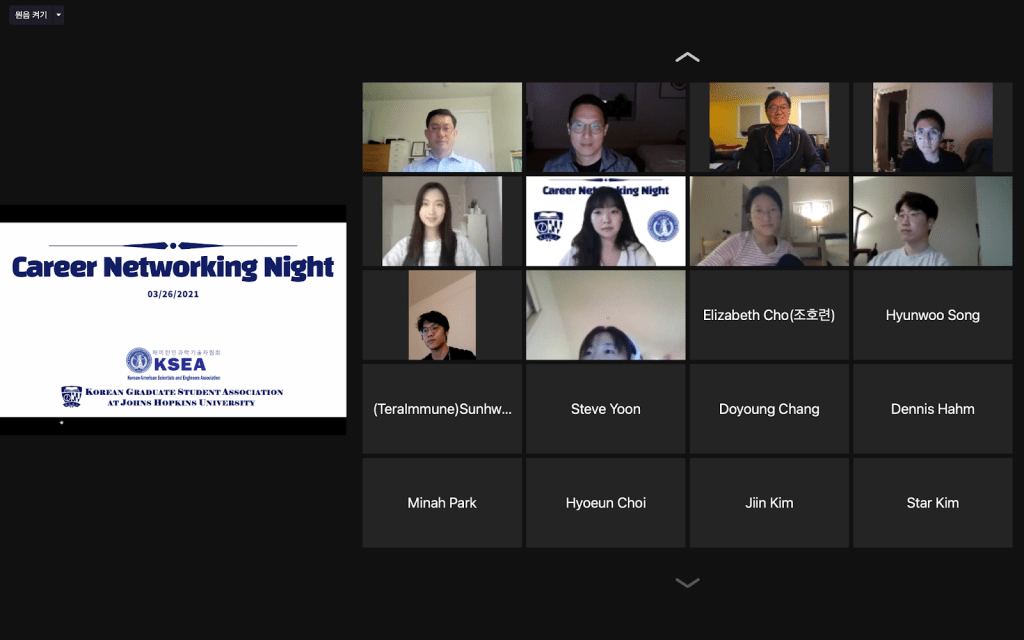Career Networking Night, sponsored by the KSEA Washington Metro Chapter, was held on Friday, March 26th, 2021 with graduate students and post-doctoral researchers at Johns Hopkins University. The event was organized by KSEA and Johns Hopkins University Korean Graduate Student Association (JHU KGSA) to provide networking opportunities for current graduate students and post-docs. In addition, the event aimed to recruit new KSEA members and introduce various KSEA events. This was the first collaborative event between JHU KGSA and KSEA Washington Metro chapter.