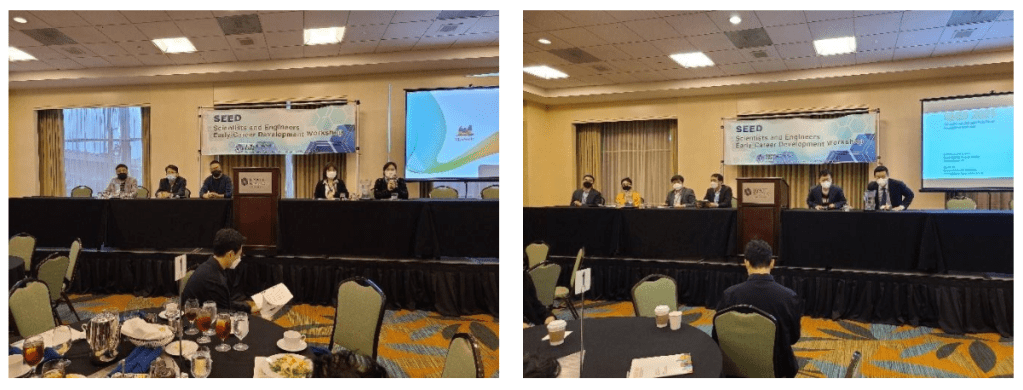Under the theme of “Building a Sustainable and Successful Career and Life”, the intention of this year’s program was to provide opportunities to discuss sustainable career planning & development, and cultivate mentoring relationships among participants. The SEED 2021 comprised three plenary sessions, three panel discussions, subgroup meetings, and a lightning talk session. Each plenary session included 10-20 minutes of Q&A at the end. In panel discussions, the panelists briefly shared their stories, and then engaged in further discussions with the audience. Through collaboration with KOFST YG, plenary sessions and panel discussions were broadcasted via Zoom to the invited participants from Korea. After the group dinner, we hosted subgroup meetings, which were designed to foster informal, direct conversations between mentees and mentors. Last but not least, the lightning talk session aimed to explore collaboration opportunities among the participants. In the SEED 2021 workshop, we also hosted tea time meetings (both in person and Zoom meetings) for SEED participants to meet with leaders of national laboratories, universities and industries from Korea.