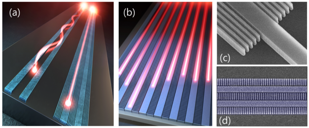 In general, PICs utilize both TE and transverse-magnetic (TM) polarizations. Due to PIC’s asymmetric width-to-height aspect ratio, each mode exhibits different modal properties and usage. For example, TM is widely used for optical sensing with its vertically extended skin depth. The TM mode’s less confinement makes it easier to interact with nearby devices, which is, at the same time, not ideal for dense integration. The research goal of the Yong Investigator Grant (YIG), supported by the Korean-American Scientists and Engineers Association (KSEA), was to overcome this TM crosstalk challenge. Here the orientation of SWGs is rotated, forming orthogonal anisotropic metamaterials compared to the eskid waveguide. Figure 1(b) illustrates the conceptual SWG waveguides for TM crosstalk suppression, and Fig. 1(d) shows the fabricated SEM image. With this scheme, the TM mode forms leaky-like oscillations in the SWG claddings, achieving zero crosstalk via anisotropic perturbation [8]. It is counter-intuitive to achieve a zero crosstalk with a leaky mode since a leaky mode typically shows a strong coupling even at far distances with its radiative waves. However, by engineering the anisotropic optical properties of SWGs, dielectric perturbations could cancel out couplings from each field component and achieve zero crosstalk completely. This non-trivial coupling phenomenon was experimentally demonstrated, suppressing the crosstalk talk by more than two orders of magnitude [8]. Since we have shown this on a conventional silicon-on-insulator (SOI) platform, the scheme is directly applicable to other applications with much higher chip integration density for TM polarization.