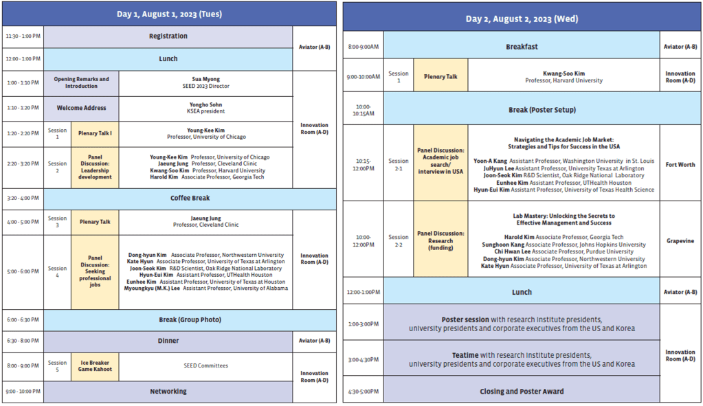 SEED 2023 was held at the Hyatt Regency DFW, Dallas, Texas on August 1-2, 2023. This workshop supported by KSEA since 2013, has provided mentorship to, and help develop the careers of, junior Korean-American scientists and engineers. I am honored and privileged to be given an opportunity to organize this important workshop as a SEED director with a phenomenal group of committee members, including Prof. Hae-bum Yun (University of Central Florida), Prof. Yumi Kim (Johns Hopkins University), Prof. Juhun Lee (University of Pittsburgh) and Prof. Seungil Kim (University of Pittsburgh).