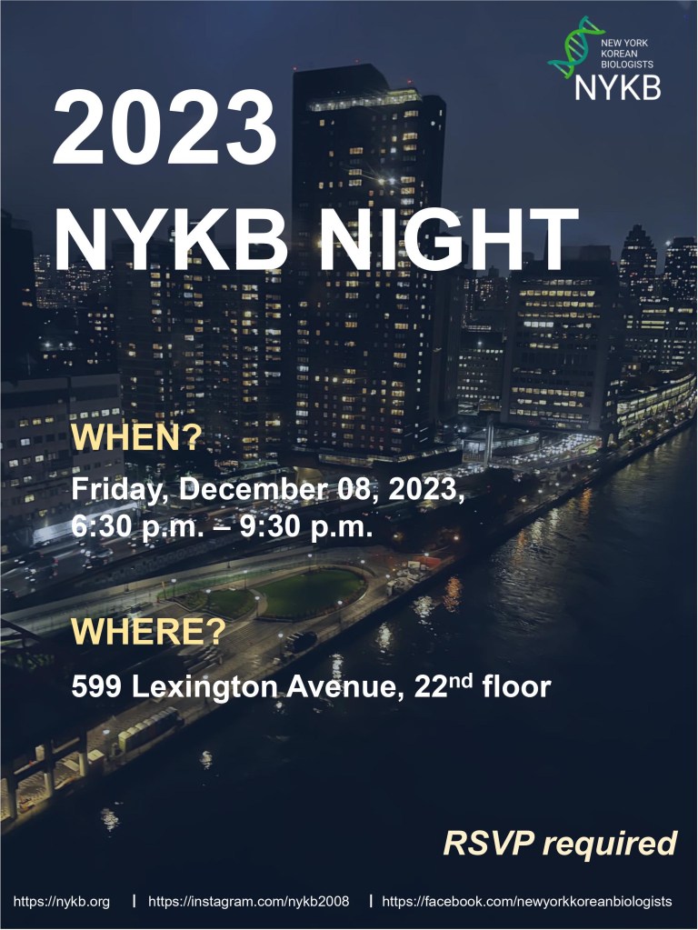 The 2023 NYKB Night, hosted by the New York Korean Biologists (NYKB) to celebrate the end of the year, warmly concluded. This event served as a valuable opportunity to introduce NYKB and KSEA, facilitating networking among established researchers as well as those recently joining New York and New Jersey. The evening was filled with delightful dining and vibrant networking opportunities. Moreover, it spotlighted the upcoming NYKB seminar series from January to March 2024, the annual conference on April 27, 2024, and future KSEA-NY activities, thereby amplifying scientific collaboration and exchange. The event also successfully encouraged new sign-ups for KSEA membership.