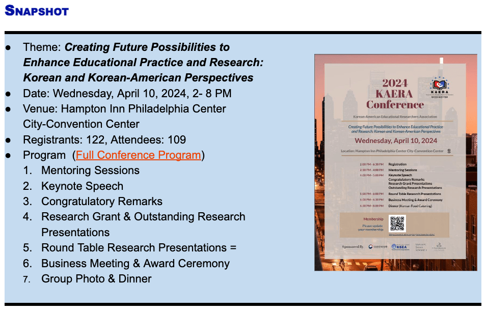 A total of 17 graduate students, early career scholars, and seasoned scholars received KAERA awards, research grants, and scholarships. Dr. Kyunghwa Lee, a professor at the University of Georgia, was honored with the KAERA Leadership Award. She emphasized the importance of continuing Korean heritage in a foreign land. The president of KAERA, Dr. Jongpil Cheon, a professor at Texas Tech University reported on the 23-24 business report thanked the 23-24 leadership team, and introduced the new leadership team, which will be led by Dr. Junghwan Kim, an associate professor at Texas A&M University. They exchanged university t-shirts as a symbol of mutual support.