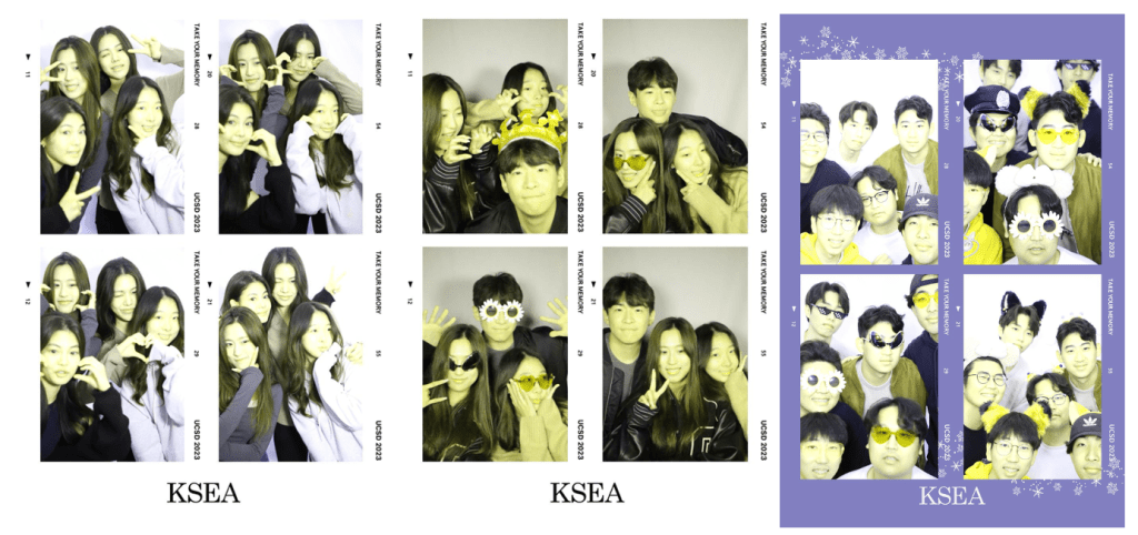 The most memorable, effortful, and popular social event that KSEA-YG @UCSD held was the “Photo Booth Event.” Last year, our group wanted to come up with a unique idea for a fundraising event, while most of the other organizations simply sold food or accessories. It is a fact that the operation of this Photo Booth Event—motivated by Life4Cuts—was nearly five times more work than we initially gauged. However, we can confidently say that the popularity our club gained from this event was worth much more than our extensive amount of work. First, we rented a professional camera, lighting, rooms, monitors, remotes, and curtains. Then, we prepared a monitor and connected it to the camera to show a real-time screen to the customers. Lastly, our engineers created a piece of code to automate the process of inserting photos into the Life-4-Cut-esqe formatted frame. Making all of these tasks possible on the event date, we obtained around 50 customers in one day. Based on this remarkable success, we held this event again this year and are planning to host it again next school year.