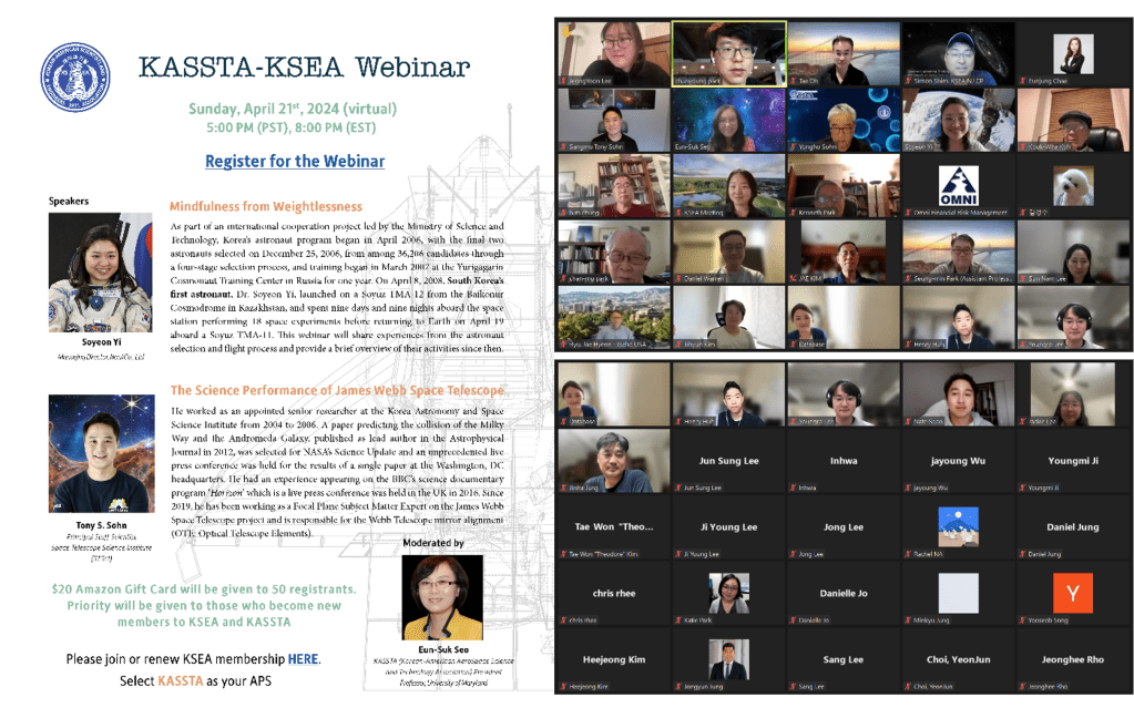 KASSTA had its first Webinar on April 21. It was organized jointly with KSEA. There were two invited speakers: Dr. Soyeon Yi, the first astronaut of Korea, and Dr. Tony S. Sohn, Principal Staff Scientist of the Space Telescope Science Institute (STScI). Dr. Yi gave a presentation entitled “Mindfulness from Weightlessness,” and Dr. Tony S. Sohn gave a presentation entitled “The Science Performance of James Webb Space Telescope.” The Webinar was moderated by Professor Eun-Suk Seo, KASSTA President. The Webinar was a great success with 78 participants, many of whom became new KASSTA/KSEA members. Each talk was 20 minutes, but the Webinar lasted one and a half hours, including many questions and vibrant discussions.