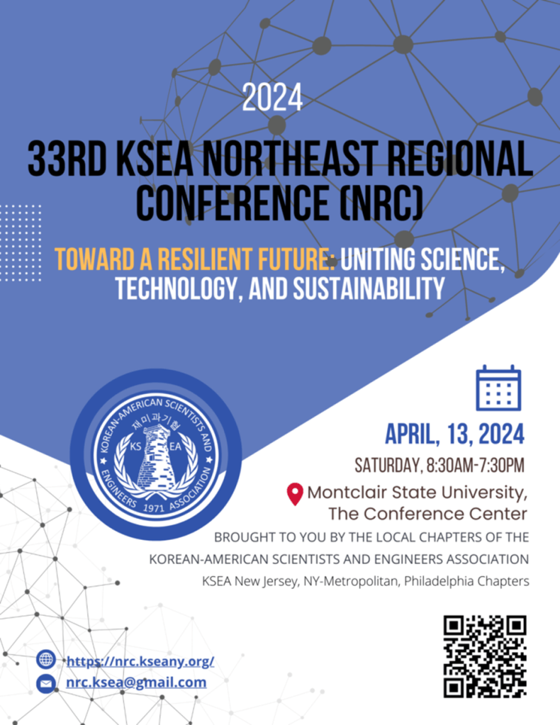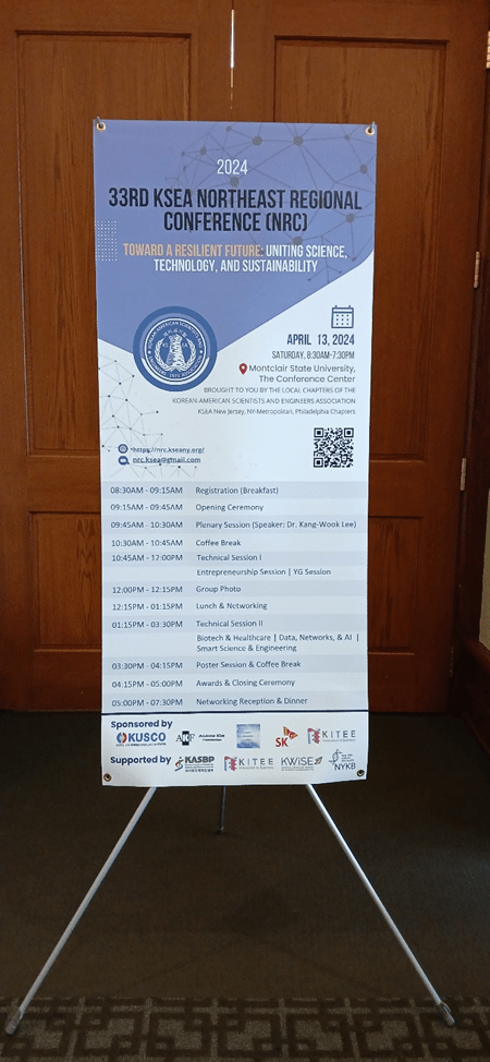 The 33rd Northeast Regional Conference (NRC) 2024 was jointly organized by the New Jersey, New York Metropolitan, and Philadelphia Chapters of Korean-American Scientists and Engineers Association (KSEA). This year NRC was sponsored by nonprofit organizations, KSEA and the Korea-U.S. Science Cooperation Center (KUSCO), and it was held in the collaboration with local societies and KSEA- affiliated professional societies (APSs), including KASBP, KITEE, KWiSE, NYKB, and PKSA.